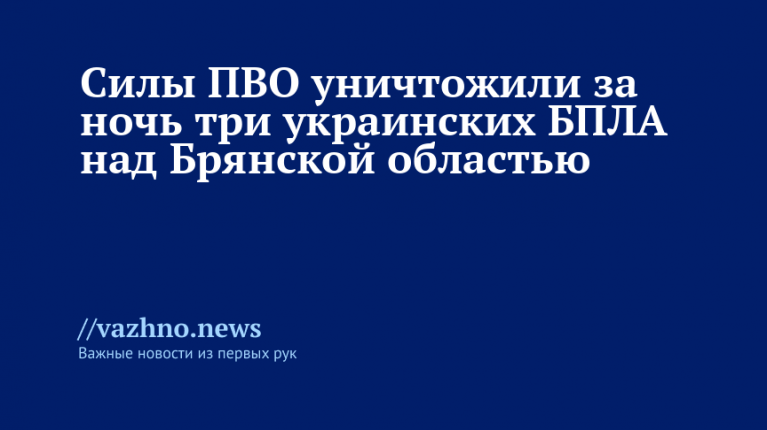 За ночь силы противовоздушной обороны Российской Федерации перехватили и уничтожили три беспилотных летательных аппарата (БПЛА), принадлежащих Вооруженным силам Украины (ВСУ), которые были зафиксированы над Брянской областью. Об этом среду, 30 июля, сообщило Министерство обороны России.