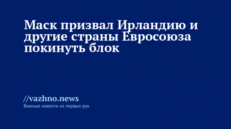 Американский миллиардер и предприниматель Илон Маск призвал Ирландию вместе с остальными странами Европейского союза (ЕС) выйти из этого объединения. Соответствующее заявление он опубликовал 1 августа на своей странице в социальной сети X (ранее Twitter).