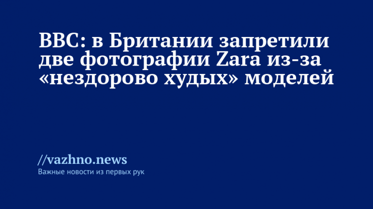 В Великобритании запретили две рекламные фотографии модного бренда Zara, поскольку на них были изображены модели с «нездорово худым» внешним видом. Об этом 6 августа сообщает телерадиокомпания BBC.