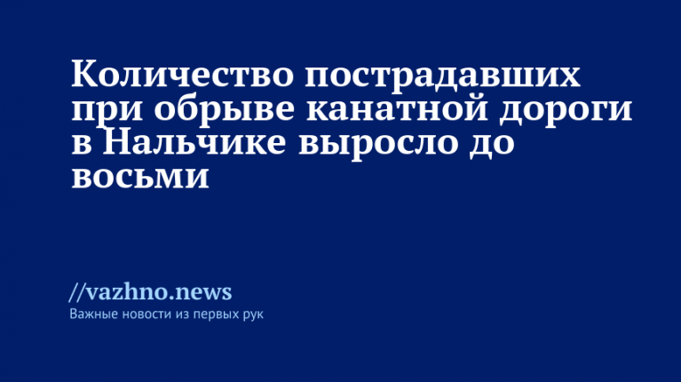 Число пострадавших в результате обрыва канатно-кресельной дороги в курортной зоне Нальчика возросло до восьми человек, один из них находится в отделении реанимации. Об этом 8 августа поведали в пресс-службе министерства здравоохранения Кабардино-Балкарии.