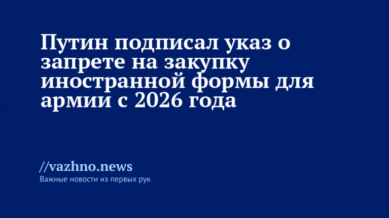 Президент России Владимир Путин издал указ, согласно которому с 2026 года запрещается закупать для военнослужащих Вооруженных сил РФ военную форму, импортированную из-за рубежа. Данный указ был размещен 11 августа на официальном государственном правовом портале.