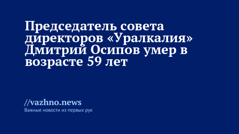 «Группа компаний «Уралхим» с глубоким прискорбием информирует о внезапной смерти председателя совета директоров «Уралкалия» Дмитрия Осипова, которому было 59 лет», — говорится в официальном сообщении.