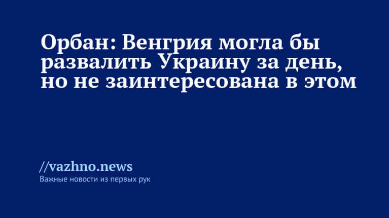 «Мы могли бы за один день привести к распаду Украины. Однако это не отвечает нашим интересам. Украина получает значительную часть электроэнергии и газа из Венгрии. В случае аварии Украина остановится», — сообщил Орбан в интервью интернет-порталу Patriota.