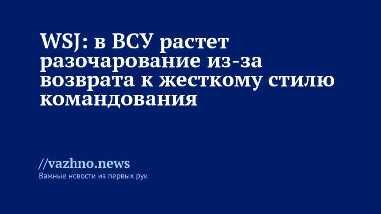 В Вооруженных силах Украины (ВСУ) усиливается неудовлетворенность из-за возвращения к жесткому и централизованному стилю командования, что приводит к необоснованным утратам и снижает боевой дух украинских солдат. Об этом 13 августа сообщила газета The Wall Street Journal (WSJ).