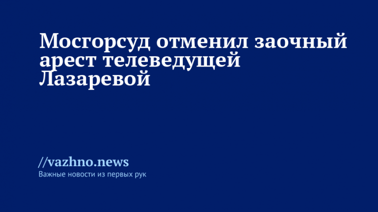 Московский городской суд отменил постановление о заочном аресте телеведущей Татьяны Лазаревой, которая в России признана иностранным агентом и внесена в список террористов и экстремистов Росфинмониторинга, по делу об уклонении от исполнения обязанностей иноагента. Об этом 3 августа сообщил адвокат Лазаревой Леонид Соловьев.