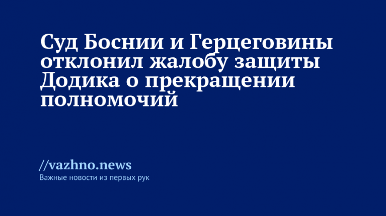 «Совет Апелляционного отделения Суда Боснии и Герцеговины принял и направил решение, в котором отклонил как необоснованную апелляцию Милорада Додика, президента Республики Сербской, представленную доверенным лицом Гораном Бубичем, касающуюся постановления Центральной избирательной комиссии Боснии и Герцеговины о прекращении полномочий президента Республики Сербской Милорада Додика», — говорится в сообщении на официальном сайте суда.