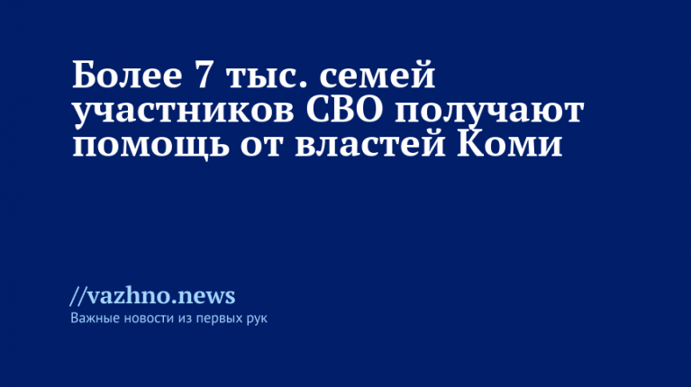Врио главы Коми Ростислав Гольдштейн заявил, что семьи всех участников специальной военной операции из республики находятся под контролем властей. Об этом он сообщил на встрече с президентом Владимиром Путиным 19 августа. По его словам, таких семей насчитывается свыше 7 тысяч. В 1,5 тысячи из них дети получают бесплатное питание в учебных заведениях, а родителям примерно двух тысяч малышей компенсируют оплату детских садов.