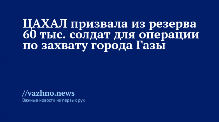 В процессе подготовки к операции по захвату города Газы Армия обороны Израиля (ЦАХАЛ) провела мобилизацию 60 тыс. военнослужащих из резерва, а также продлила сроки службы для 20 тыс. резервистов. Об этом 20 августа проинформировала пресс-служба израильских вооруженных сил.