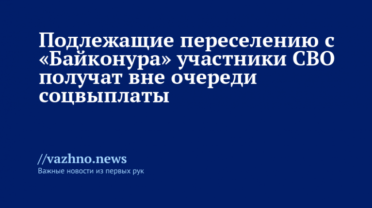 Граждане, участвующие в специальной военной операции (СВО), а также их семьи, подлежащие переселению с территории «Байконура», смогут получить социальные выплаты без очереди. Соответствующий указ президента России Владимира Путина был опубликован 20 августа на официальном портале правовой информации.
