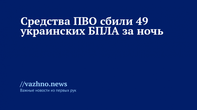 «В ночное время дежурные ПВО перехватили и уничтожили 49 беспилотников самолетного типа, принадлежащих Украине», — заявили в военном ведомстве.