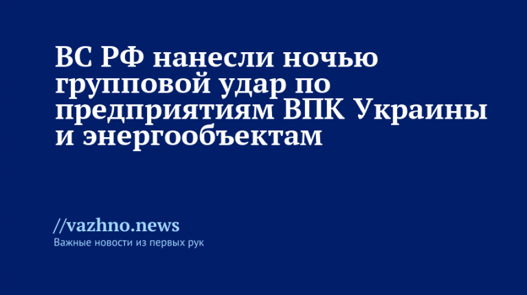 Российские военные ночью нанесли групповой удар с использованием высокоточного оружия и ударных беспилотников по предприятиям военно-промышленного комплекса и энергетическим объектам на территории Украины. Сообщение об этом поступило из Министерства обороны России 21 августа.