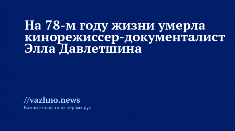 В возрасте 77 лет, после длительной болезни, ушла из жизни кинорежиссер-документалист Элла Давлетшина. Об этом 21 августа сообщили в Telegram-канале Союза кинематографистов России.