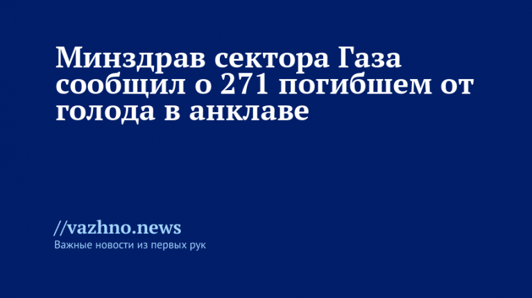 «В медицинских учреждениях сектора Газа за последние 24 часа зарегистрированы две смерти от голода и недоедания, что довело общее количество погибших до 271, включая 112 детей», — сообщается на Telegram-канале ведомства.