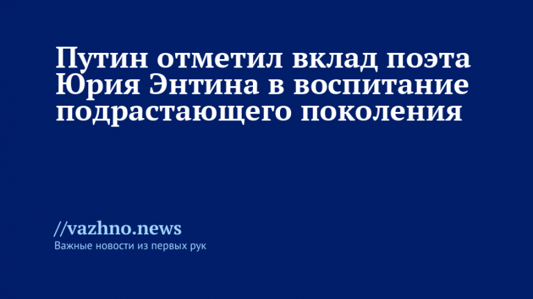 Президент России Владимир Путин 21 августа направил поздравление поэту-песеннику Юрию Энтину по случаю его 90-летия, подчеркнув значимость его вклада в воспитание молодого поколения. Текст соответствующей телеграммы был опубликован на официальном сайте Кремля.