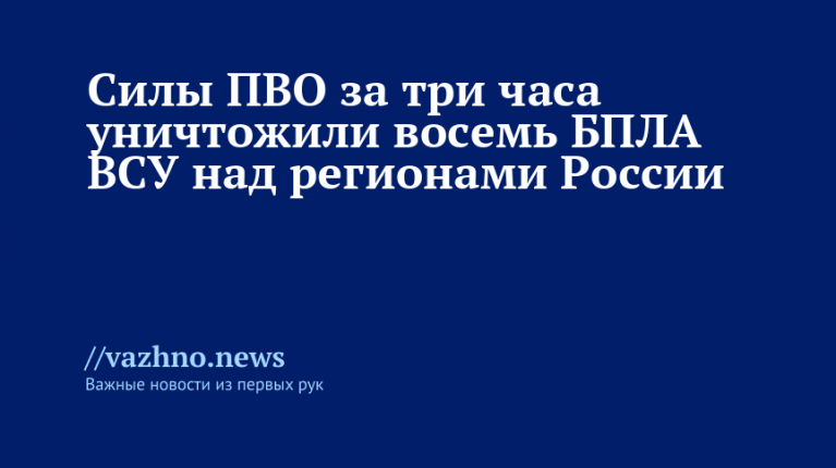 За три часа силы противовоздушной обороны уничтожили восемь беспилотных летательных аппаратов (БПЛА) Вооруженных сил Украины (ВСУ) в воздушном пространстве над регионами России. Об этом 21 августа проинформировало Министерство обороны РФ.