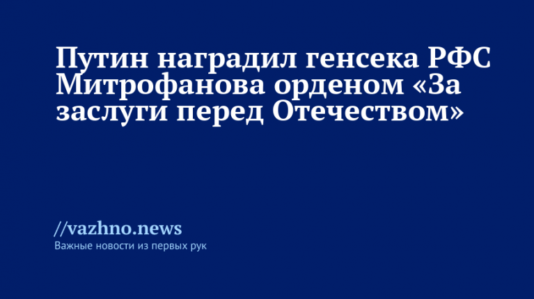 Президент Российской Федерации Владимир Путин вручил генеральному секретарю Российского футбольного союза (РФС) Максиму Митрофанову медаль ордена «За заслуги перед Отечеством» II степени. Соответствующий указ был обнародован 22 августа на официальном интернет-портале правовой информации.