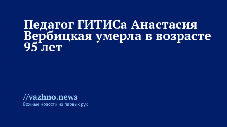 «Сегодня в возрасте 95 лет ушла из жизни Анастасия Всеволодовна Вербицкая — выдающийся педагог ГИТИСа, один из ведущих в мире специалистов по сценическому движению и фехтованию, заслуженный работник искусств России», — отмечается в заявлении.