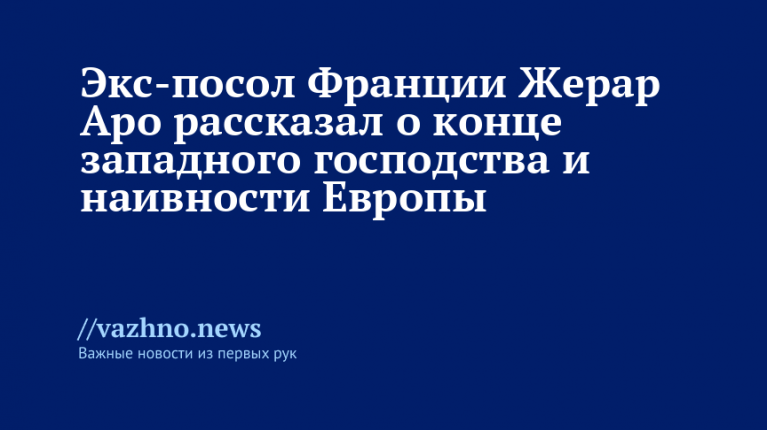 Бывший французский посол в США Жерар Аро заявил, что период западного доминирования подошел к концу, а Европа продолжает «цепляться за иллюзии» и не способна адаптироваться к новому, более жесткому мировому порядку. Об этом он рассказал 24 августа в интервью журналу Le Point.