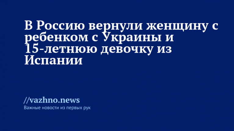 Благодаря посредничеству Катара в Россию вернулась женщина с ребенком шестилетнего возраста из Украины, а также 15-летняя девочка из Испании. Об этом 25 августа сообщила Мария Львова-Белова, уполномоченная при президенте РФ по правам ребенка.
