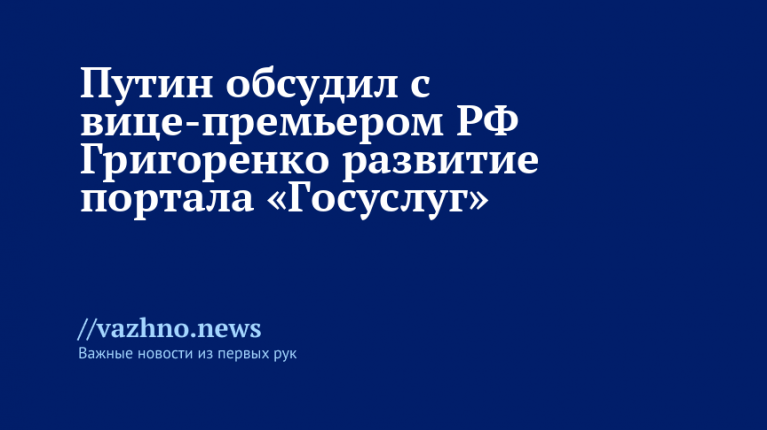 Заместитель председателя правительства Дмитрий Григоренко провел обсуждение с президентом России Владимиром Путиным развития портала «Госуслуг» и внедрения цифровых технологий в государственном секторе. Об этом 25 августа сообщили в пресс-службе Кремля.