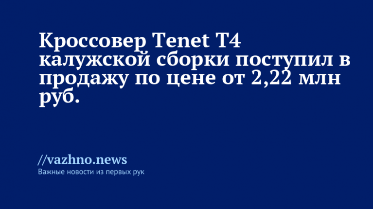 Модель Tenet T4 является второй машиной российского бренда, запущенной в производство на бывшем заводе Volkswagen после старта выпуска кроссовера T7.