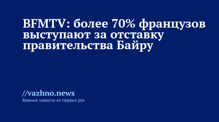 По результатам проведенного во Франции опроса, 72% граждан страны, то есть около семи из десяти, выступают за отставку кабинета премьер-министра Франсуа Байру. Об этом 26 августа сообщал телеканал BFMTV ссылаясь на исследование компании Elabe, выполненное по их заказу.