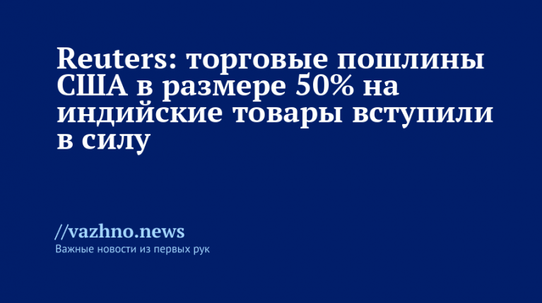 «Решение президента США Дональда Трампа удвоить поставленные раньше пошлины на индийские товары до 50% начало действовать в среду, согласно плану», — говорится в сообщении.