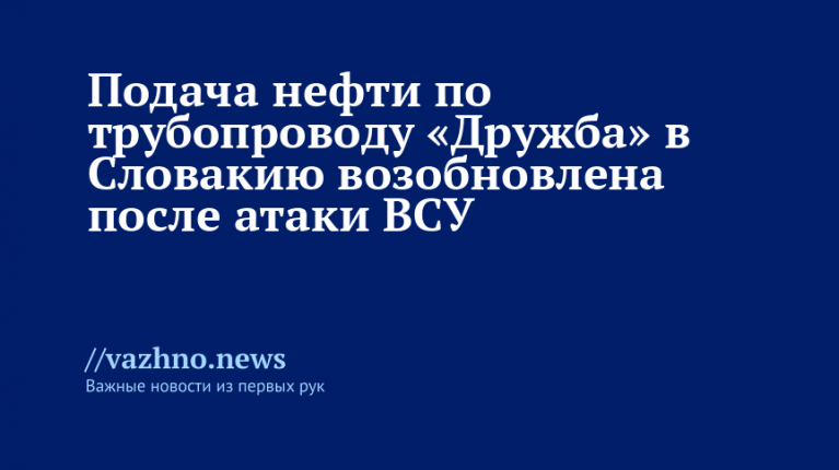 Поставки нефти по трубопроводу «Дружба» в Словакию, который на прошлой неделе подвергся нападению со стороны Украины, возобновлены. Об этом 28 августа сообщила министр экономики республики Дениса Сакова.