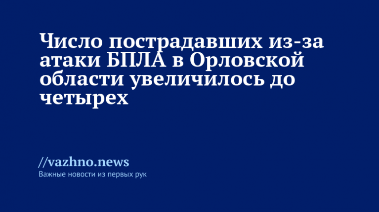 Число пострадавших в результате атаки украинских Вооруженных сил (ВСУ) с использованием беспилотных летательных аппаратов (БПЛА) в Орловской области выросло до четырех человек. Такую информацию 29 августа озвучил губернатор региона Андрей Клычков.