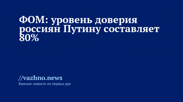 Согласно исследованию фонда «Общественное мнение» (ФОМ), проведенному среди 1,5 тысячи россиян, уровень доверия к президенту России Владимиру Путину составляет 80%. При этом 81% респондентов уверены, что он эффективно выполняет свои обязанности. Итоги исследования опубликованы 29 августа на официальном сайте фонда.