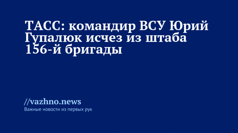 Командир 156-й отдельной механизированной бригады Вооруженных сил Украины (ВСУ) Юрий Гупалюк пропал из штаба своей бригады. Об этом 30 августа сообщило агентство ТАСС со ссылкой на данные от источника в российских силовых структурах.
