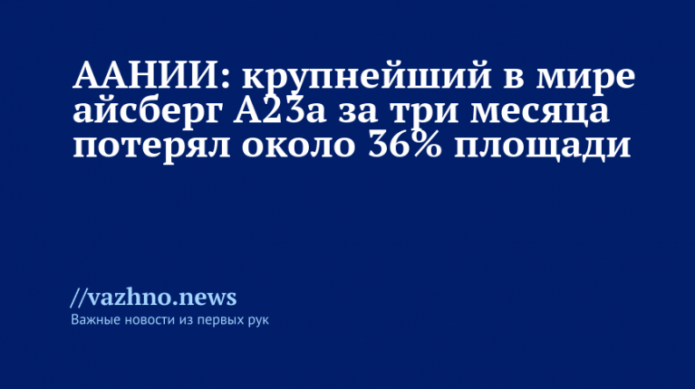 Крупнейший айсберг в мире, обозначенный как А23а, за прошедшие три месяца сократил свою площадь примерно на 36%, расколовшись на несколько частей. Такая информация появилась 1 сентября в пресс-релизе Арктического и антарктического научно-исследовательского института (ААНИИ).
