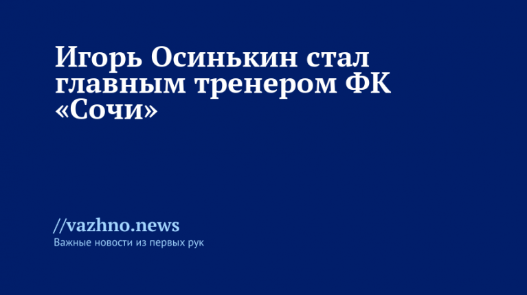 Игорь Осинькин назначен на должность главного тренера футбольного клуба (ФК) «Сочи». Об этом 1 сентября в интервью изданию «Спорт-Экспресс» сообщил президент клуба Борис Ротенберг.