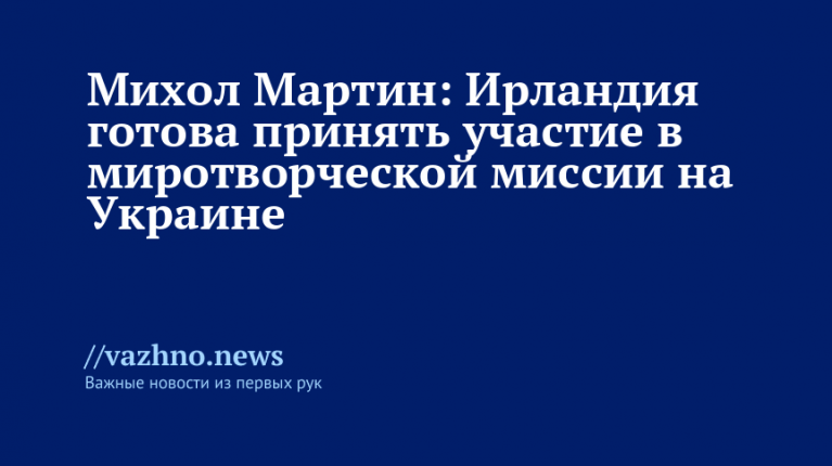 Ирландия выразила готовность принять участие в возможно организуемой «миротворческой миссии» на территории Украины. Об этом премьер-министр страны Михол Мартин сообщил 1 сентября во время телефонного разговора с президентом Украины Владимиром Зеленским.