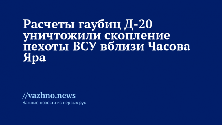 Расчеты 152-миллиметровых гаубиц Д-20 из Ивановского гвардейского воздушно-десантного соединения, входящего в состав Южной группировки войск, уничтожили скопление пехоты Вооруженных сил Украины (ВСУ) к западу от Часова Яра в Донецкой Народной Республике (ДНР). Об этом 9 сентября сообщило Министерство обороны РФ.