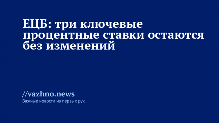 «Сегодня Совет управляющих утвердил сохранение всех трех ключевых процентных ставок ЕЦБ на прежнем уровне. В настоящий момент инфляция находится около 2%, что соответствует среднесрочной цели, и оценка Совета управляющих прогнозов инфляции в целом осталась неизменной», — отмечается в заявлении.