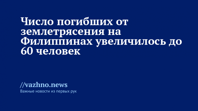 Число жертв землетрясения на Филиппинах возросло до 60 человек. Об этом 1 октября заявил исполняющий обязанности главы управления Бернардо Рафаэлито Алехандро IV.
