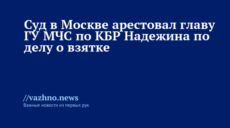 Басманный районный суд Москвы поместил в следственный изолятор начальника Главного управления МЧС России по Кабардино-Балкарской Республике Михаила Надежина, который обвиняется в получении взятки в особо крупном размере. Информация об этом была обнародована 2 октября пресс-службой общей юрисдикции судов города.