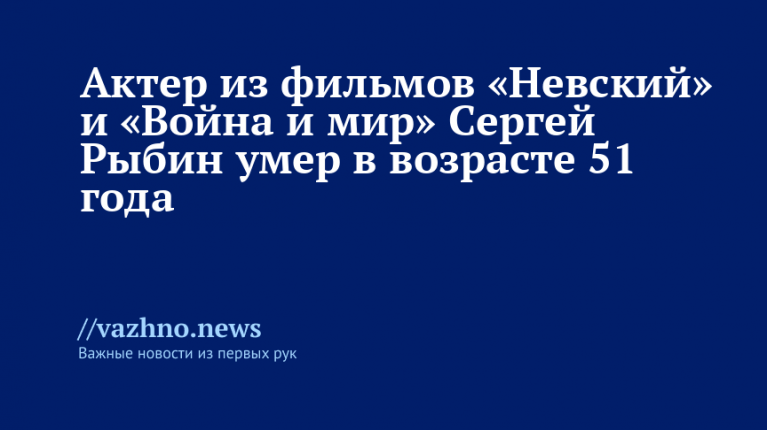 Известный актер и каскадер Сергей Рыбин, сыгравший в таких проектах, как «Морские дьяволы», «Война и мир» и «Невский», скончался в возрасте 51 года. Об этом 2 октября было сообщено на сайте «Кино-театр.ру».