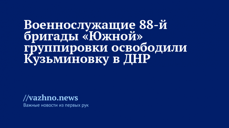 Солдаты 88-й отдельной мотострелковой бригады 3-й общевойсковой армии в составе «Южной» группировки войск освободили населенный пункт Кузьминовка в Донецкой Народной Республике (ДНР) от формирований Вооруженных сил Украины (ВСУ). Об этом 6 октября проинформировала пресс-служба Минобороны России.