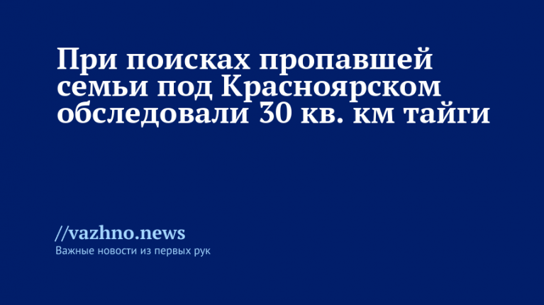 Для поиска пропавшей семьи Усольцевых в Красноярском крае была подключена служба уголовного розыска главного управления МВД по региону, обследовано около 30 квадратных километров тайги. Об этом сообщили 6 октября в пресс-службе ведомства.