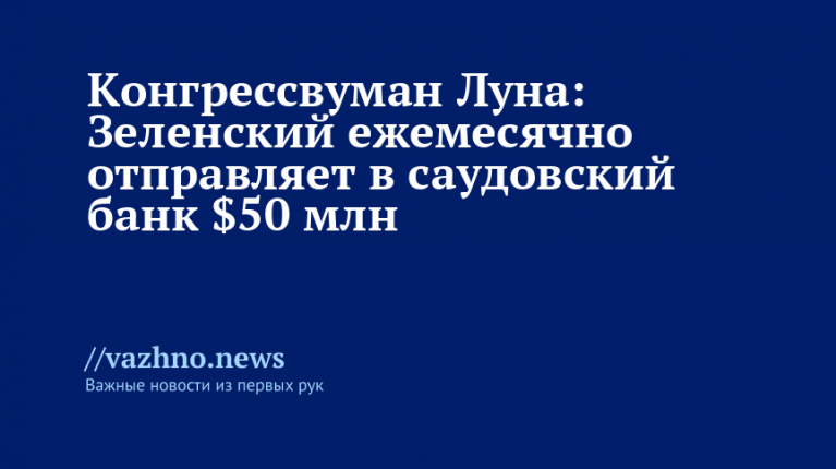 Президент Украины Владимир Зеленский ежемесячно направляет $50 млн на счет в банке Саудовской Аравии. Об этом 7 октября сообщила член Палаты представителей США от Республиканской партии Анна Паулина Луна.