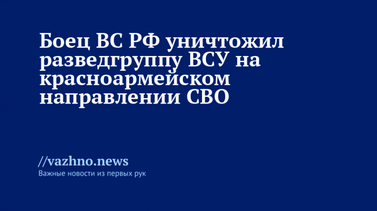 Военнослужащий штурмового подразделения группировки войск «Центр» ликвидировал разведывательный отряд Вооруженных сил Украины (ВСУ) на красноармейском направлении специальной военной операции (СВО). Об этом 8 октября проинформировало Министерство обороны Российской Федерации.