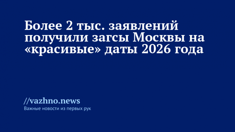 Начальник управления ЗАГС Москвы Светлана Уханева сообщила, что в московские загсы уже поступило свыше 2 тысяч заявлений на регистрацию брака, даты которых считаются «красивыми» в 2026 году — это примерно 30% от общего объема поданных заявок.
