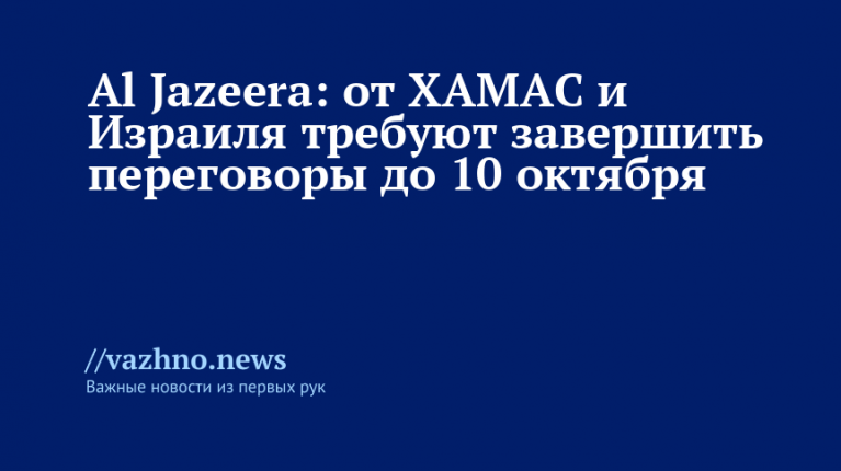 Посредники, участвующие в переговорах между Израилем и палестинской организацией ХАМАС, потребовали завершить переговорный процесс не позднее 10 октября. Об этом 8 октября сообщил катарский телеканал Al Jazeera, ссылаясь на информированный источник.
