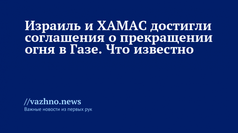 Палестинская радикальная группировка ХАМАС и Израиль договорились о прекращении огня в секторе Газа. В рамках соглашения предусмотрен вывод израильских войск, поставка гуманитарной помощи и обмен заложниками на заключенных. Более подробную информацию о договоренностях можно узнать в материале «Известий».