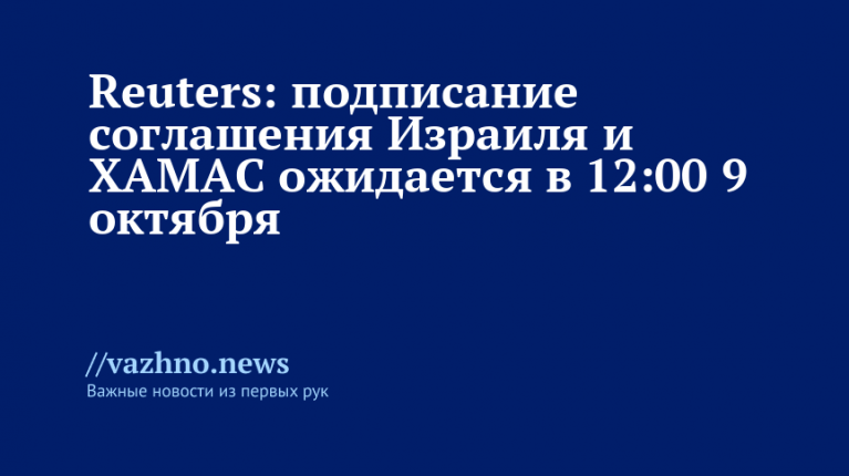 В публикации говорится: «Подписание документа по первому этапу плана президента США Дональда Трампа относительно сектора Газа запланировано на 12:00 по израильскому времени, что совпадает с московским».