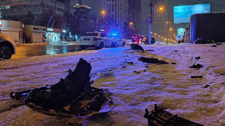 На кадрах отчетливо видно множество обломков от разбившегося авто. Тротуар покрыт снегом.