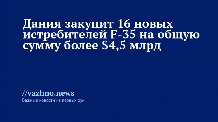 Дания планирует приобрести 16 новых истребителей F-35 на сумму свыше $4,5 млрд. Министр обороны Троэльс Лунд Поульсен в ближайшие две недели отправится в США для подписания соответствующего контракта. Об этом 10 октября сообщает местная телерадиокомпания DR со ссылкой на министерство обороны страны.