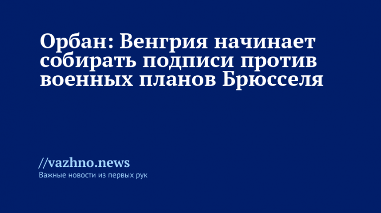 «Мы должны вновь продемонстрировать, что венгерский народ выступает против войны. Именно поэтому сегодня стартует сбор подписей против военных планов Брюсселя. Подписи будут собираться в каждом населенном пункте, ведь сейчас необходима поддержка каждого, кто желает мира», — написал Орбан на своей странице в Facebook (соцсеть принадлежит компании Meta, деятельность которой признана экстремистской и запрещена в России).